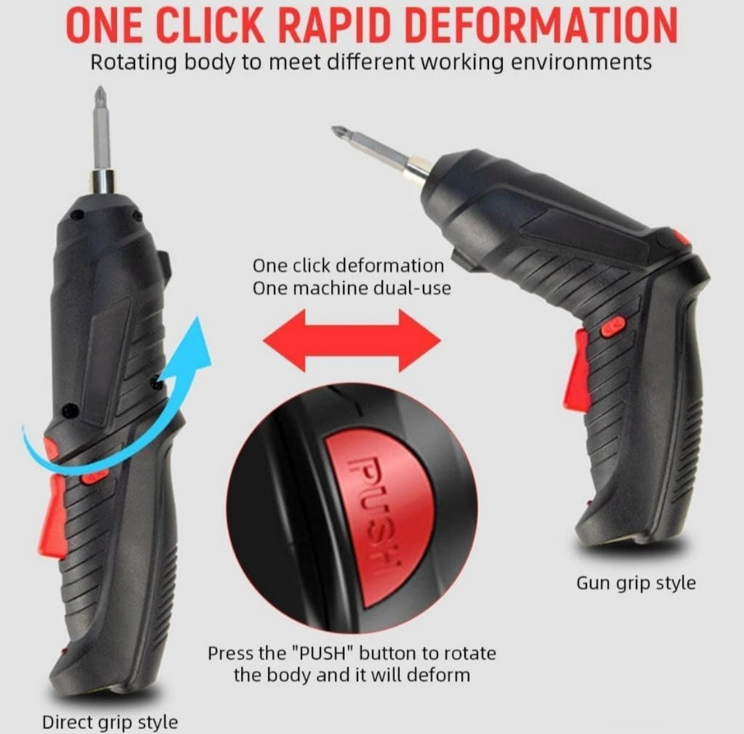 This Battery-Powered Cordless Electric Screwdriver comes with a One-Click Rapid Deformation feature – instantly switch the handle between Direct Grip or Gun Grip style for a perfect fit in every working environment.